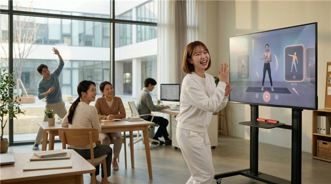 值得关注的是,C-Life数智运动旗下产品的应用场景同样延展至教职工群体。学校可将主机部署于教师办公室或架空层等区域,午休间隙,教师们可跟随主机的体感游戏或运动指导课程进行简单拉伸,缓解伏案疲劳;工会活动中,双人对战、团队闯关等项目成为释放工作压力、增进同事交流的新载体。